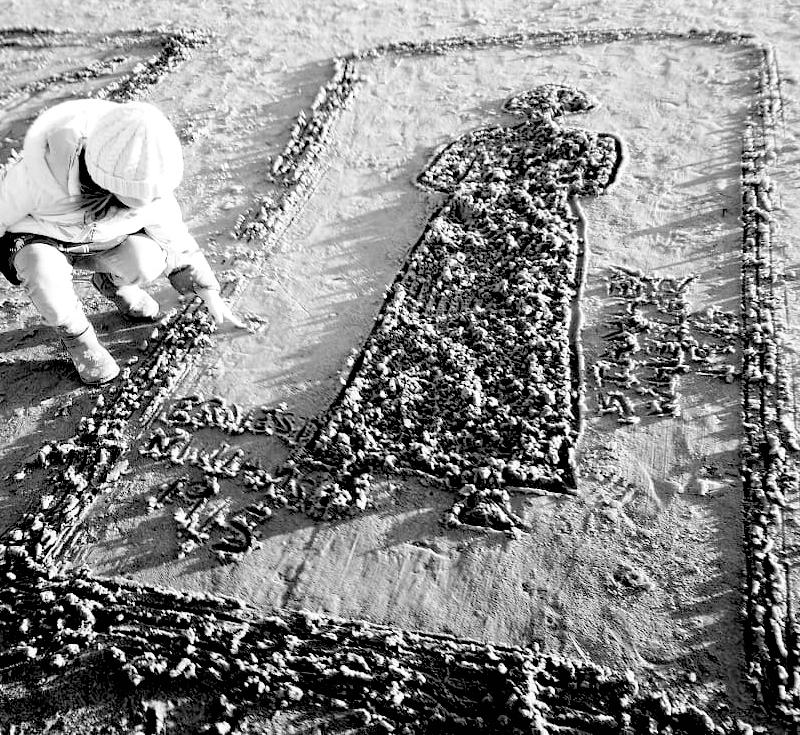 You are invited to walk over the faces and listen to the sounds they make as they shift beneath your feet.