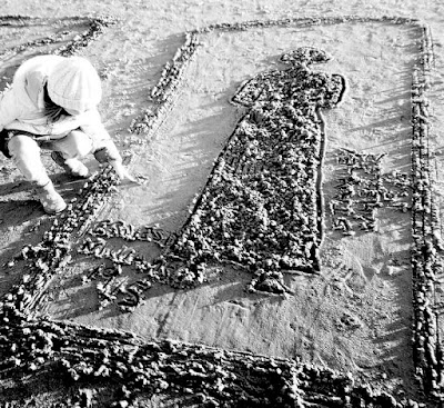 This is Leigh roughing up the exposed sand within the stencil, creating a generic image which will be part of Richard's memorial.