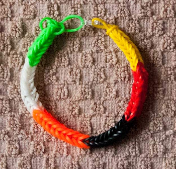 A rainbow loom Irish/German friendship bracelet. These were woven by Paul and Andrew Watson (first cousins twice removed, if you must know.)